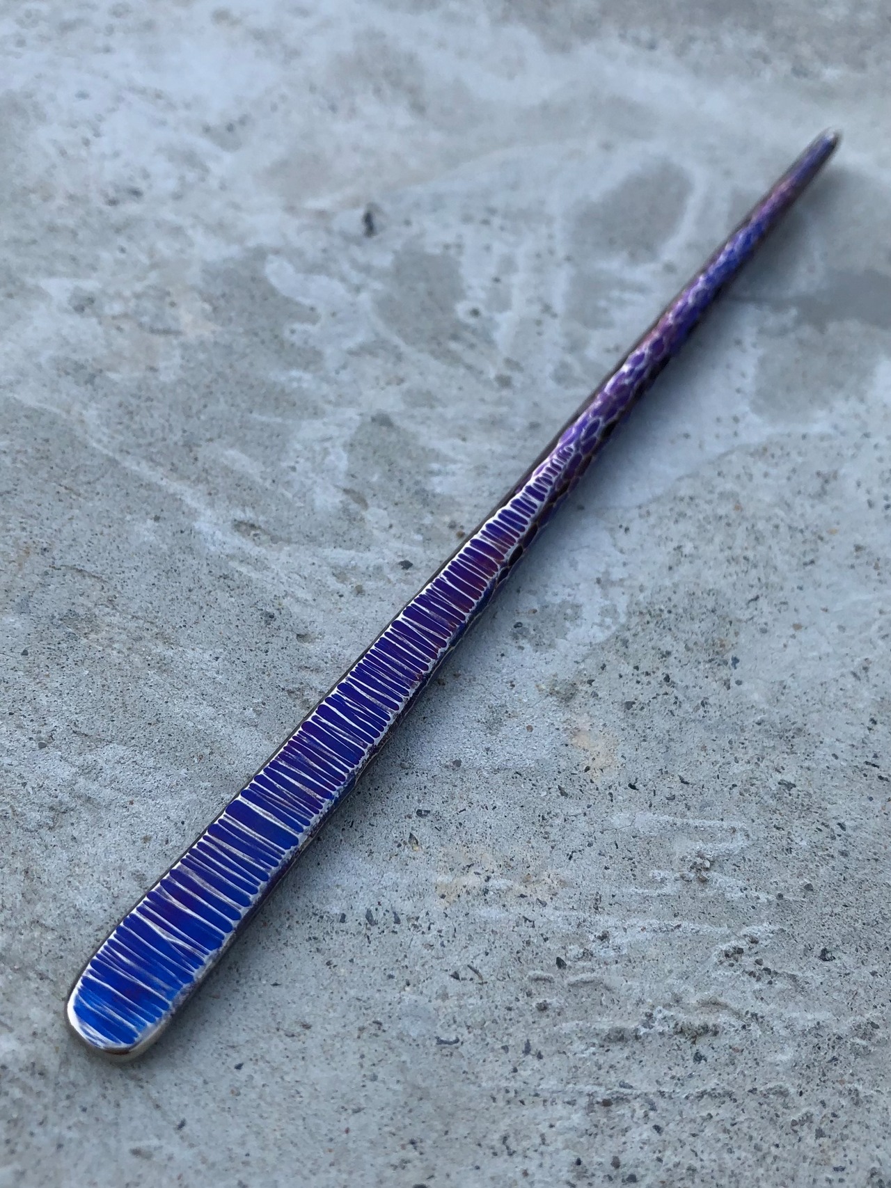 チタンを火とハンマーを使って製作しました。タイトルは王家の簪です。古代エジプト王ツタンカーメンの象徴であるブルーを入れた簪は古代人が作ったであろうを鎚目で表現し使い込んだ感じに加工しております。ボディはピュアゴールド。テーパー状に加工した簪はバランスと鎚目のグラデーションが楽しめます。純チタン製なのでとにかく軽く、頑丈で使いやすい作品です。 全長約16.5cm 6φ TB340