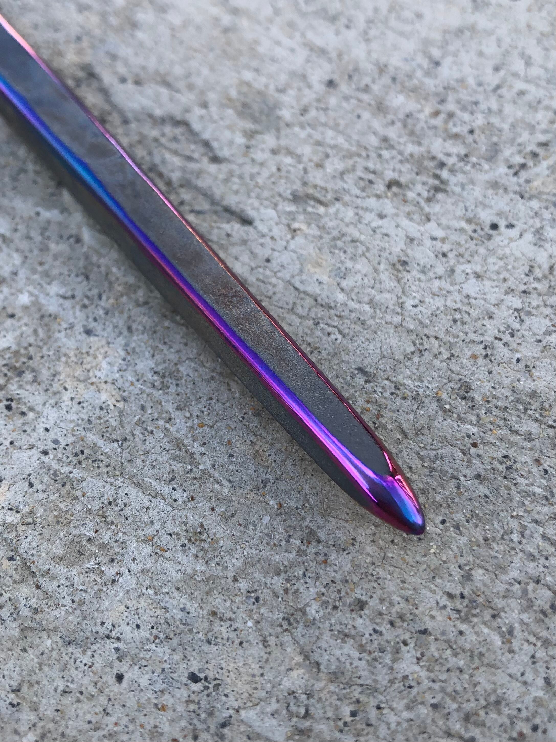 チタンを火とハンマーを使って製作しました。人気の刀の簪をベースにラインだけオーロラカラーにしてあります。マットな部分と磨きあげたたカラーのグラデーションが楽しめます。純チタン製なのでとにかく軽く、頑丈で使いやすい作品です。
