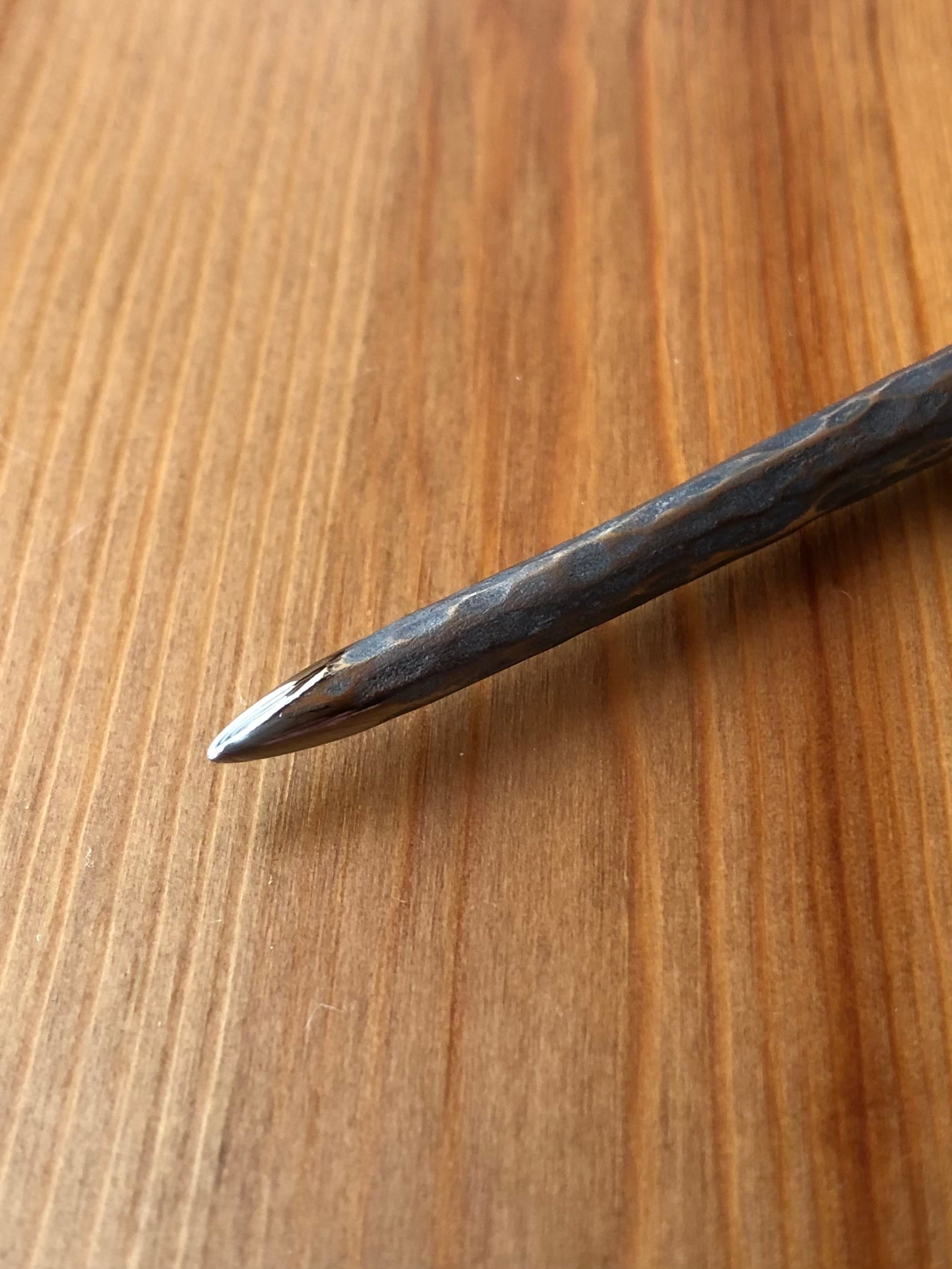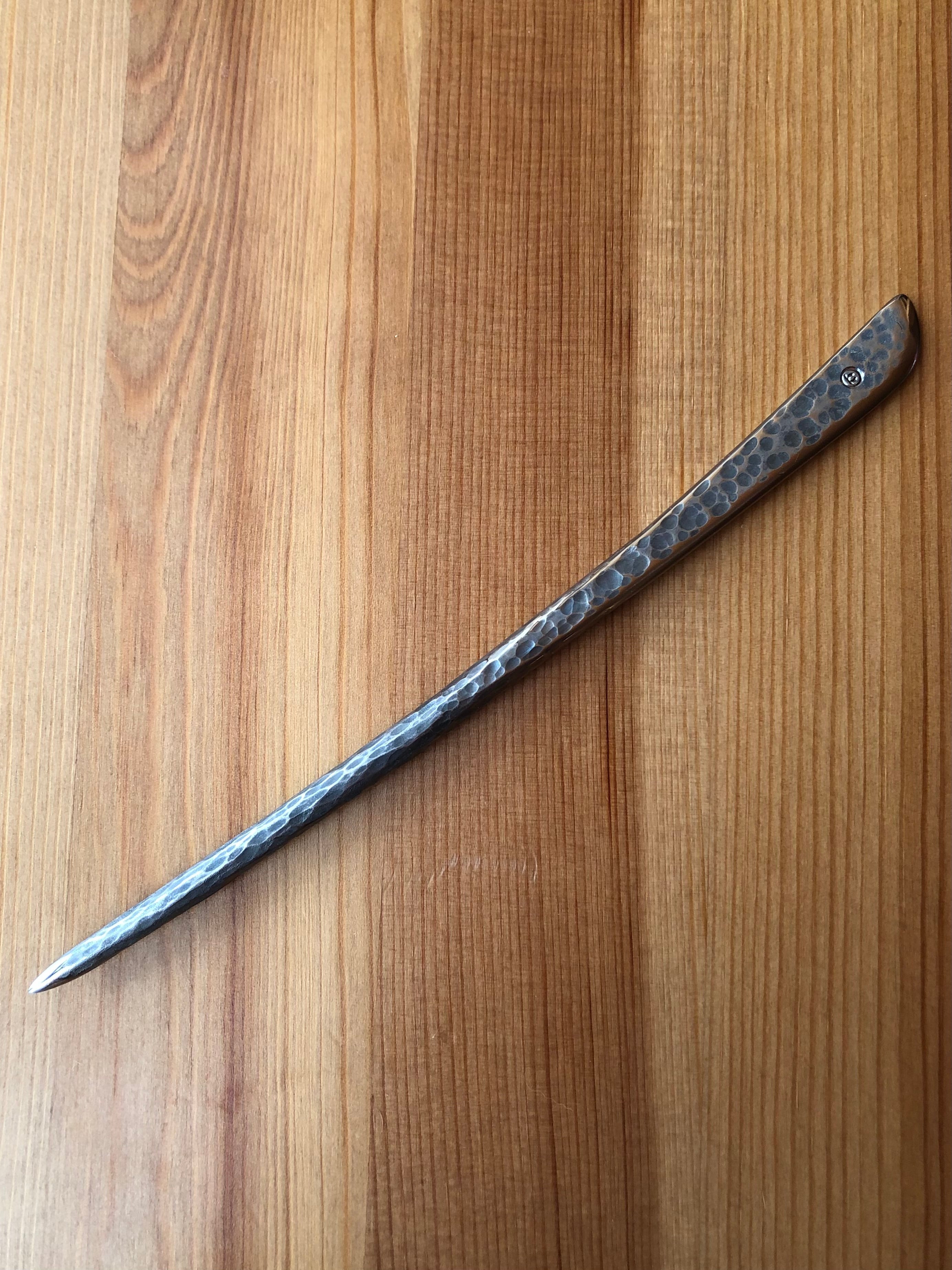チタンを火とハンマーで製作した一本刺しかんざしロング人気の刀の簪をベースに月のクレーターを表現したロングバージョンロングヘアーを綺麗にまとめられるテーパー状の作りで見た目も使いやすさにもごだわった作品。純チタン製なのでとにかく軽く、頑丈で使いやすい作品です。
