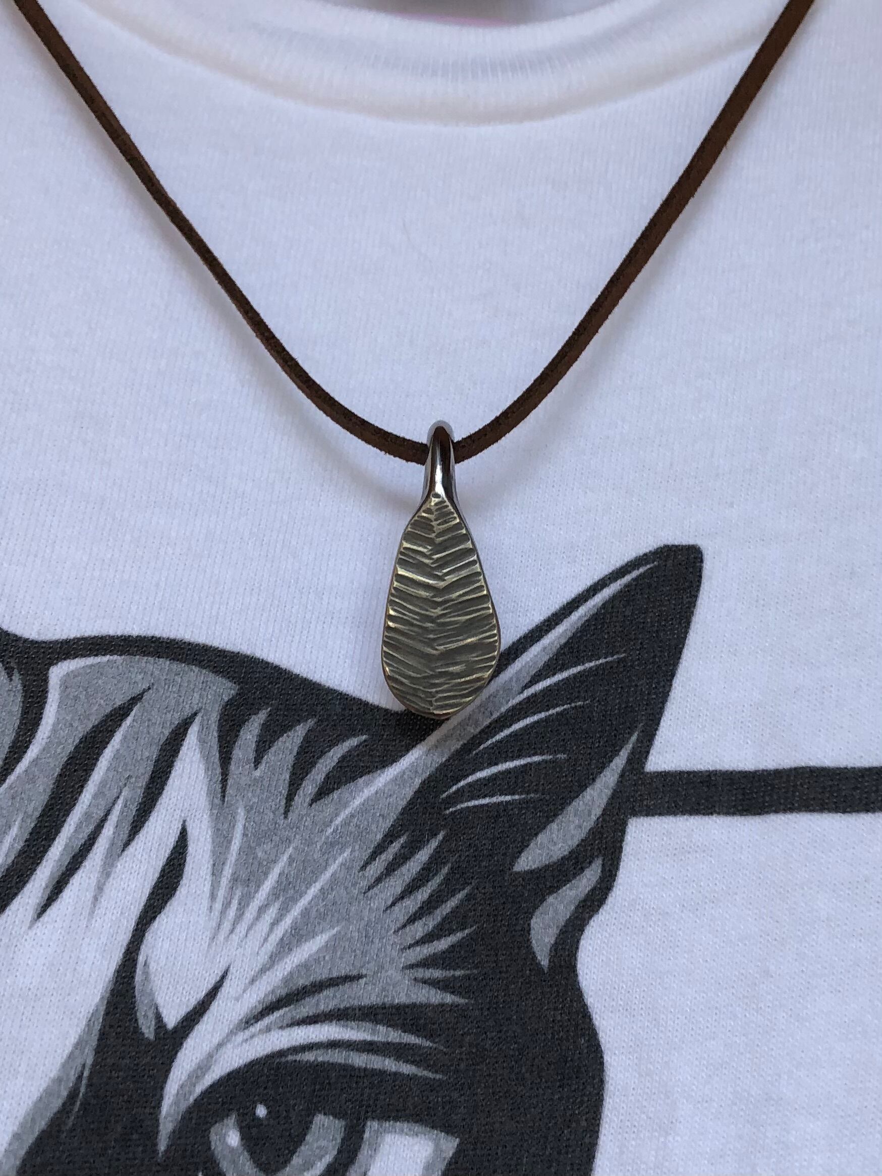 チタンを火とハンマーで製作した一枚葉のペンダントトップ。鍛造品の良さがわかる様磨いた部分とのコントラストが楽しめます。最後の画像の様に重ね付けするとさらにカッコよくなります。
