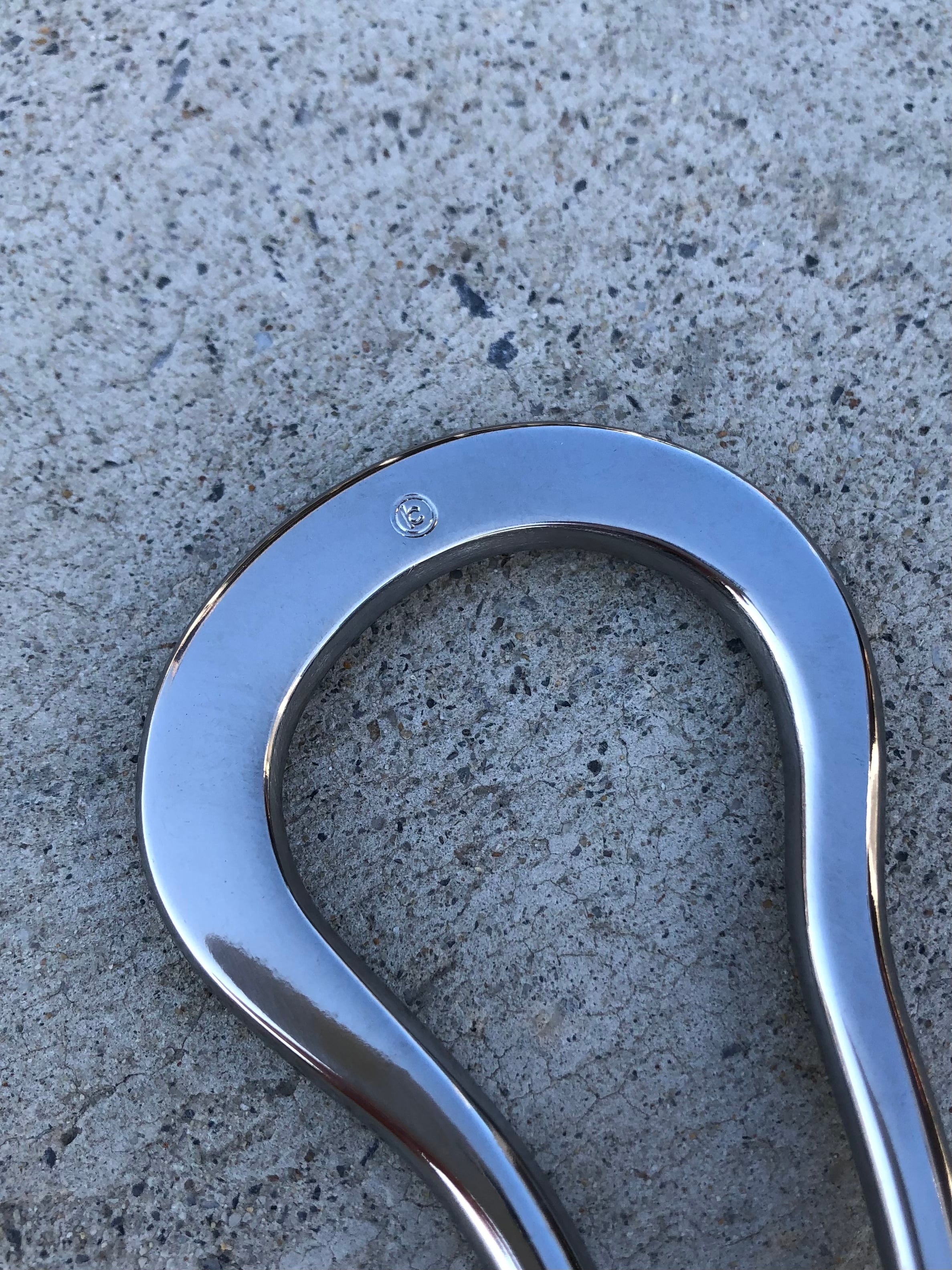 チタンを昔ながらの製法(鍛造)火とハンマーで製作しております。泳いでいるお玉杓子をイメージし立体感が出るよう曲線にこだわった作品。ヘアラインを少し残して磨きあげたシルバーが高級感あふれる作品です、アンティーク調。裏面にはショップのロゴを刻印しております。純チタン製なのでとにかく軽く、暑い季節の汗によるかぶれもないのでお客様に好評です。頑丈で使いやすく永く愛用出来る作品です。