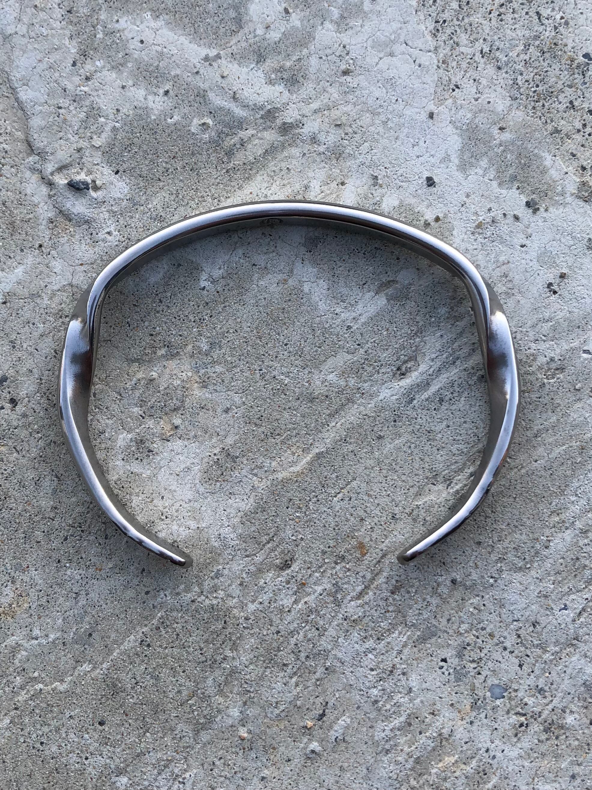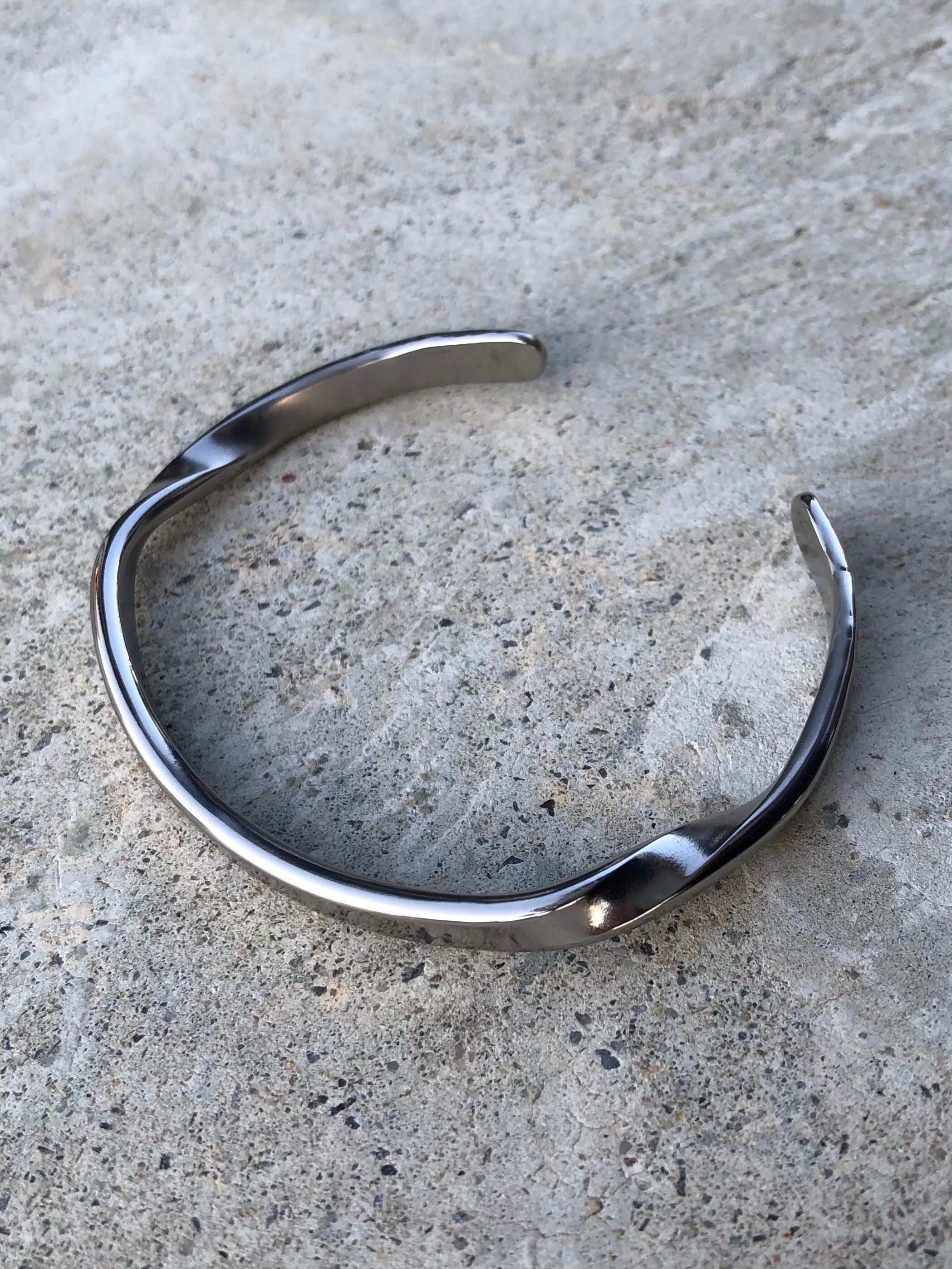 チタンをハンマーを使って表現しております。半回転捻りを入れ、エンド部に岩肌をハンマーで表現したバングル。手に馴染むよう微妙なカーブを入れたユニークな形のバングルです。