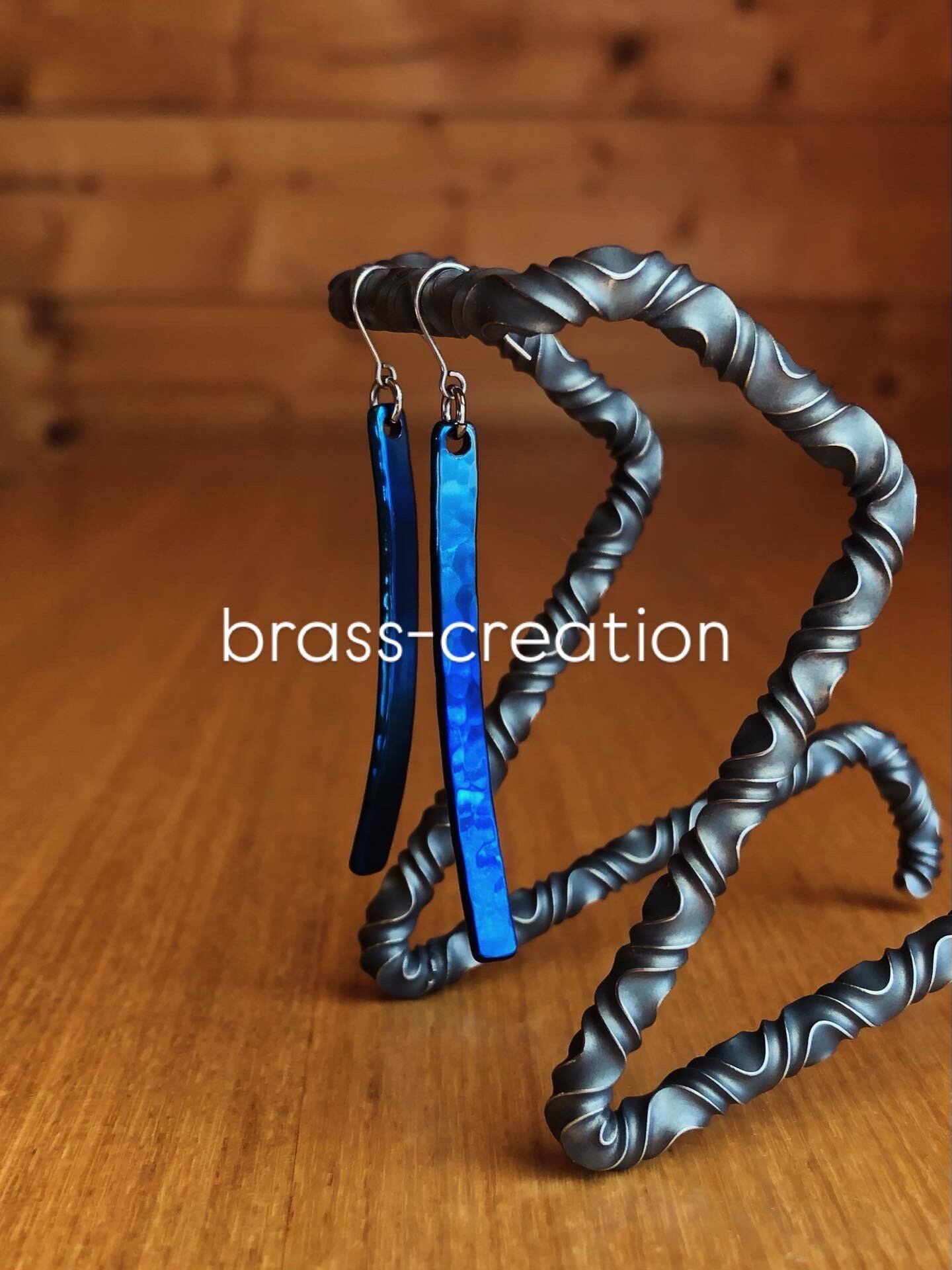 フック、マルカン、ボディ、と全てチタンでできたピアスです。ハンマーで製作しております。青い海の美しさを表現したピアス、セットのお値段です。