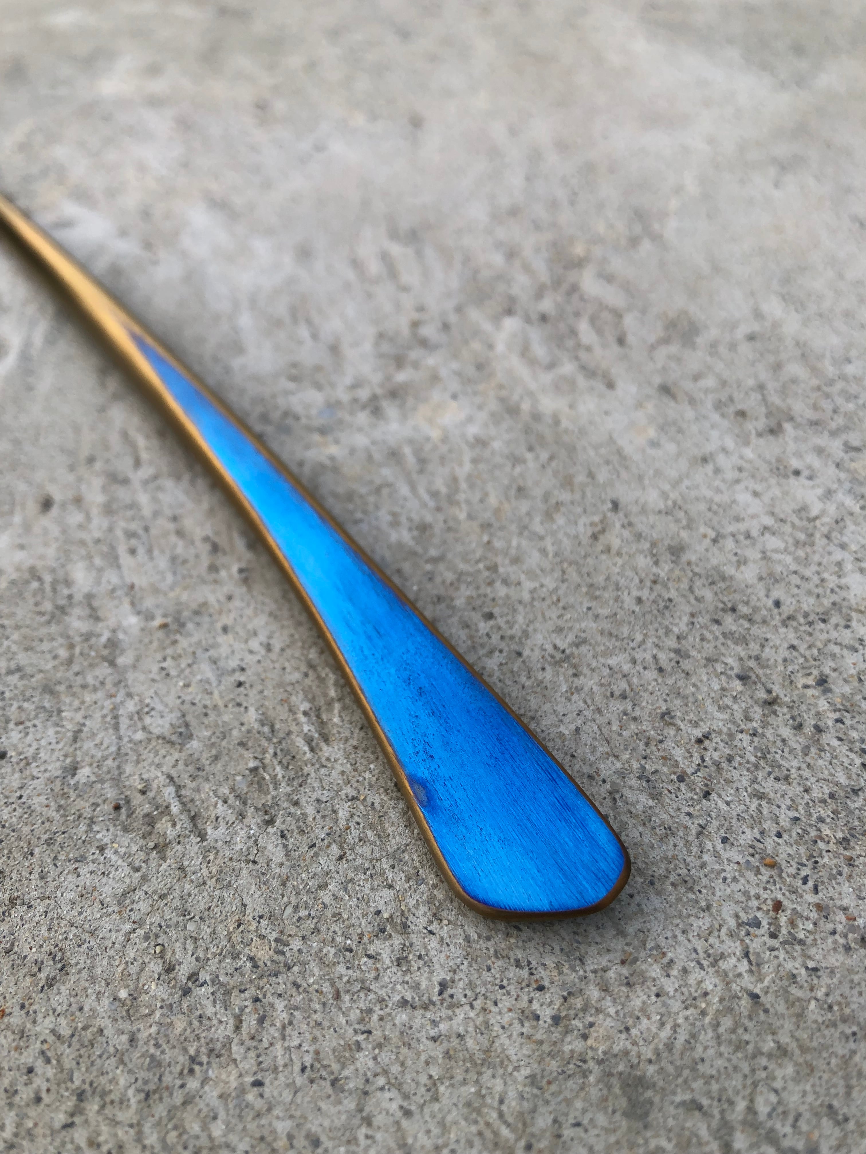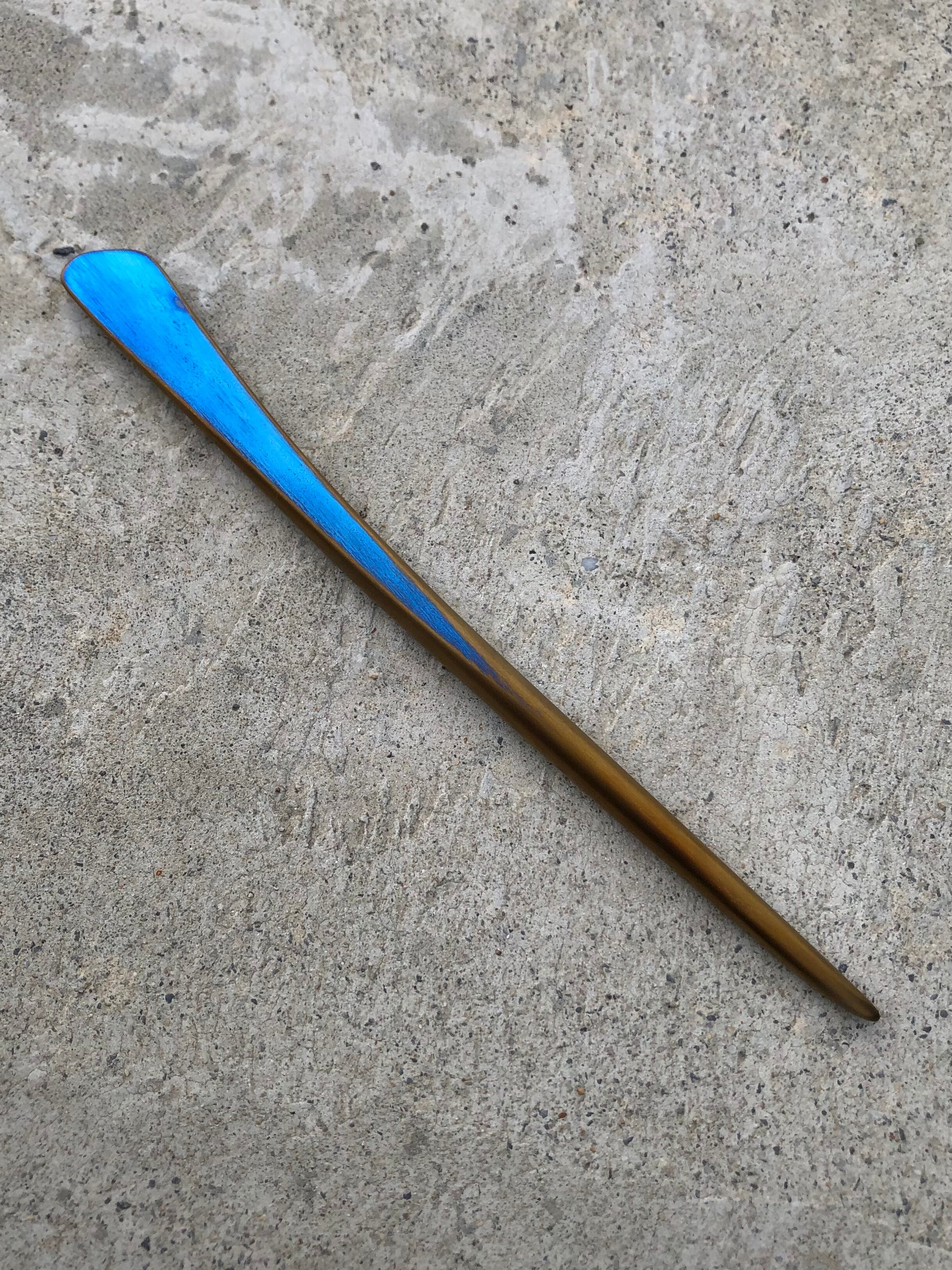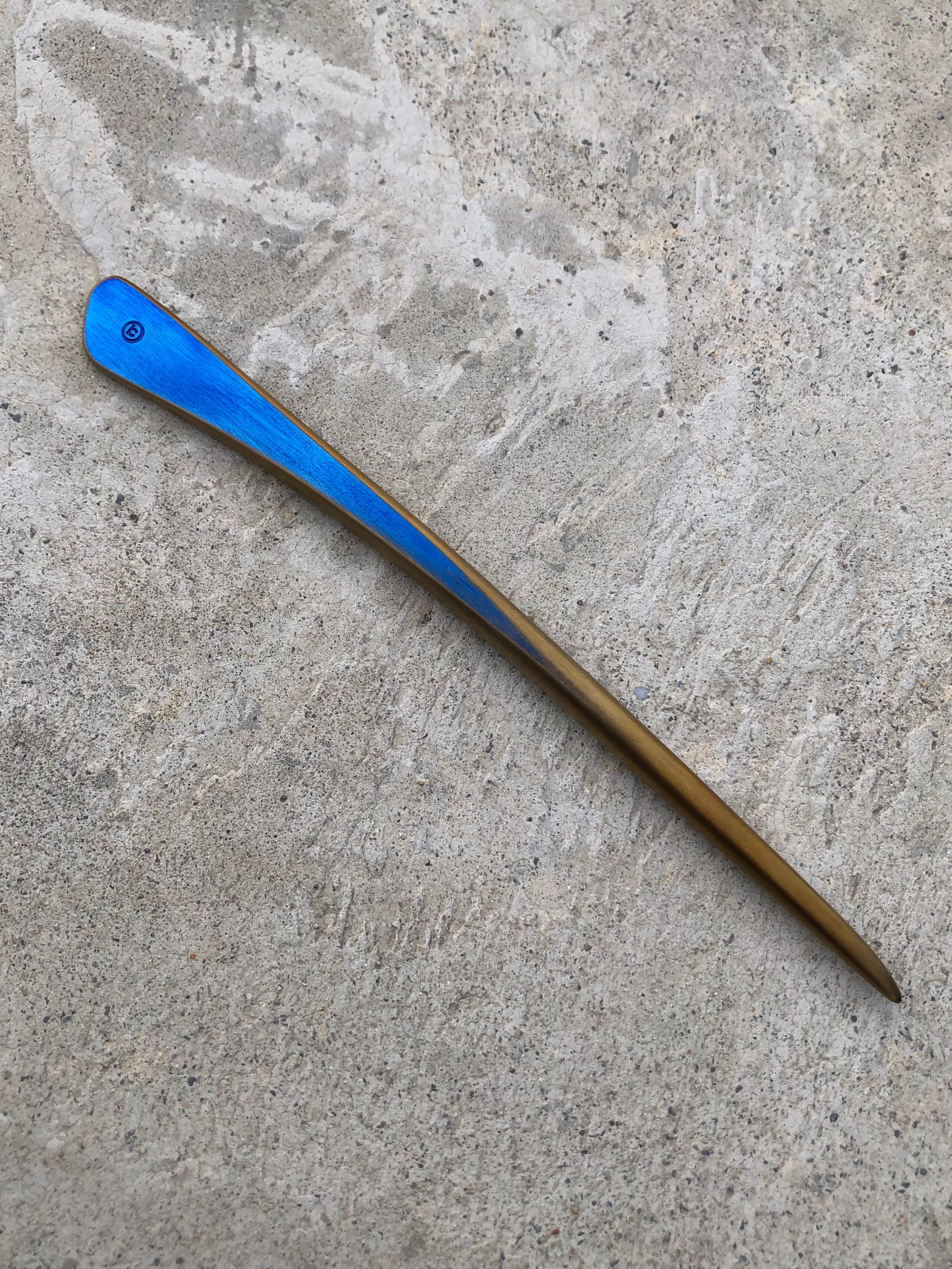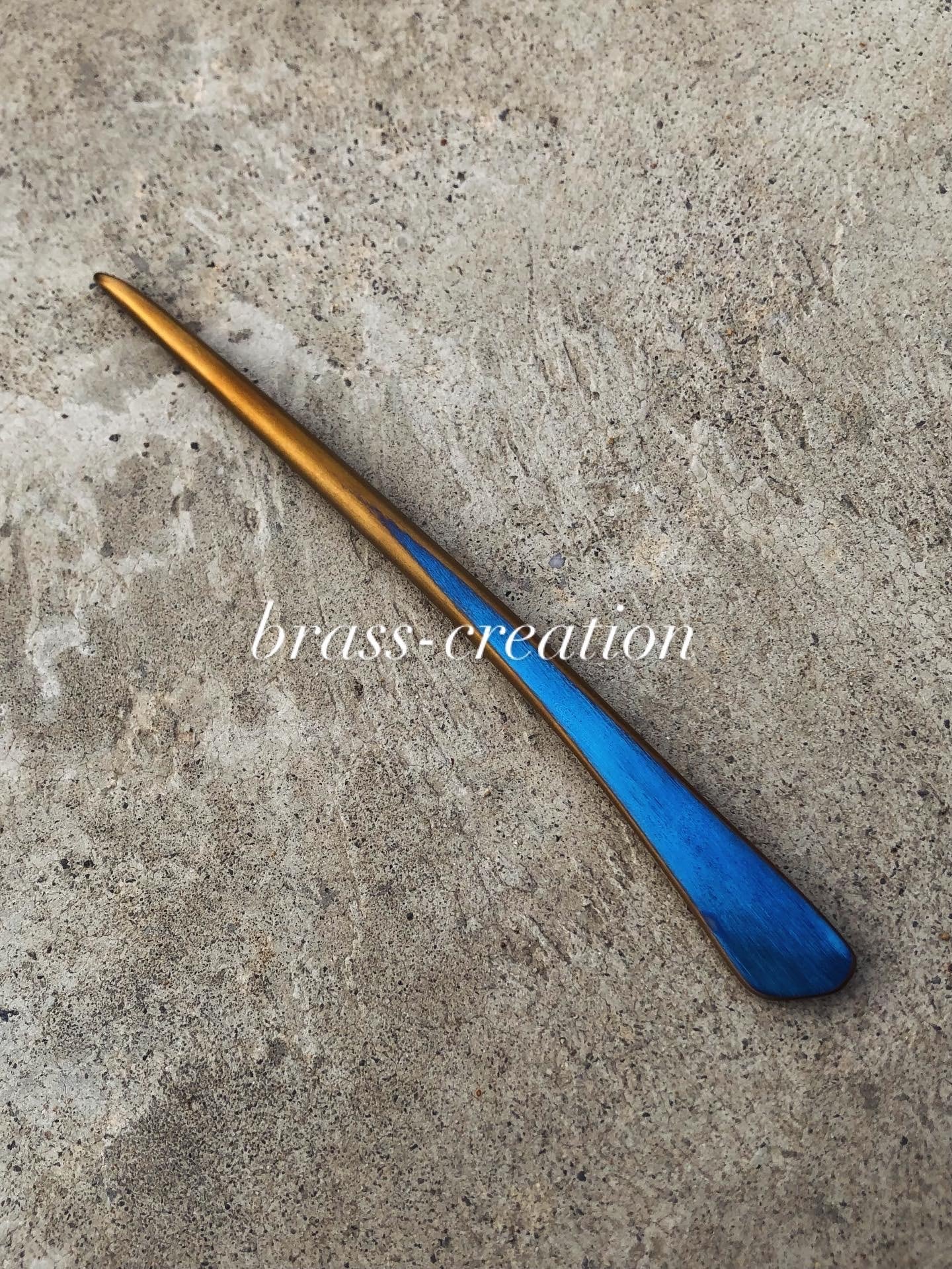 チタンを昔ながらの製法(鍛造)火とハンマーで製作しております。古代エジプトをテーマにヘアラインにブルー、ボディーにはマットゴールドとアンティーク調の渋い作品です。