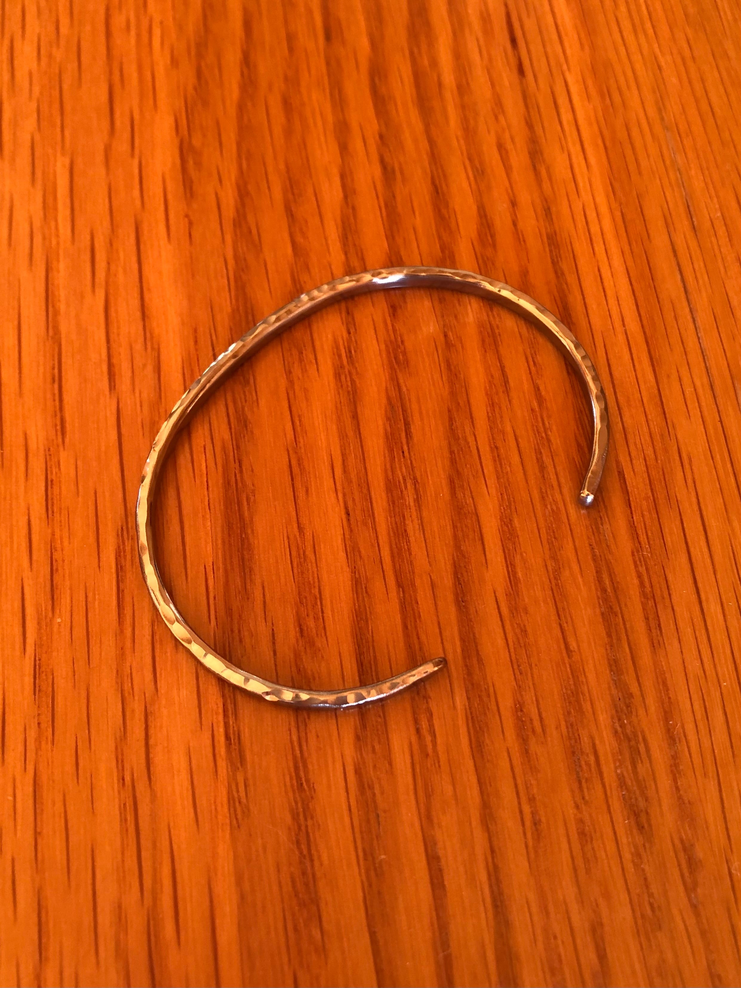 titanium bangle “silver rock” バングルは、チタンを火とハンマーを使って丹念に製作しました。岩の質感をシルバーで表現し、洗練されたデザインが際立っています。存在感はありながら、軽量でつけ心地も抜群です。特別な場面でも日常使いでもお楽しみいただけます。こちらは表面仕上げですので光沢があります。