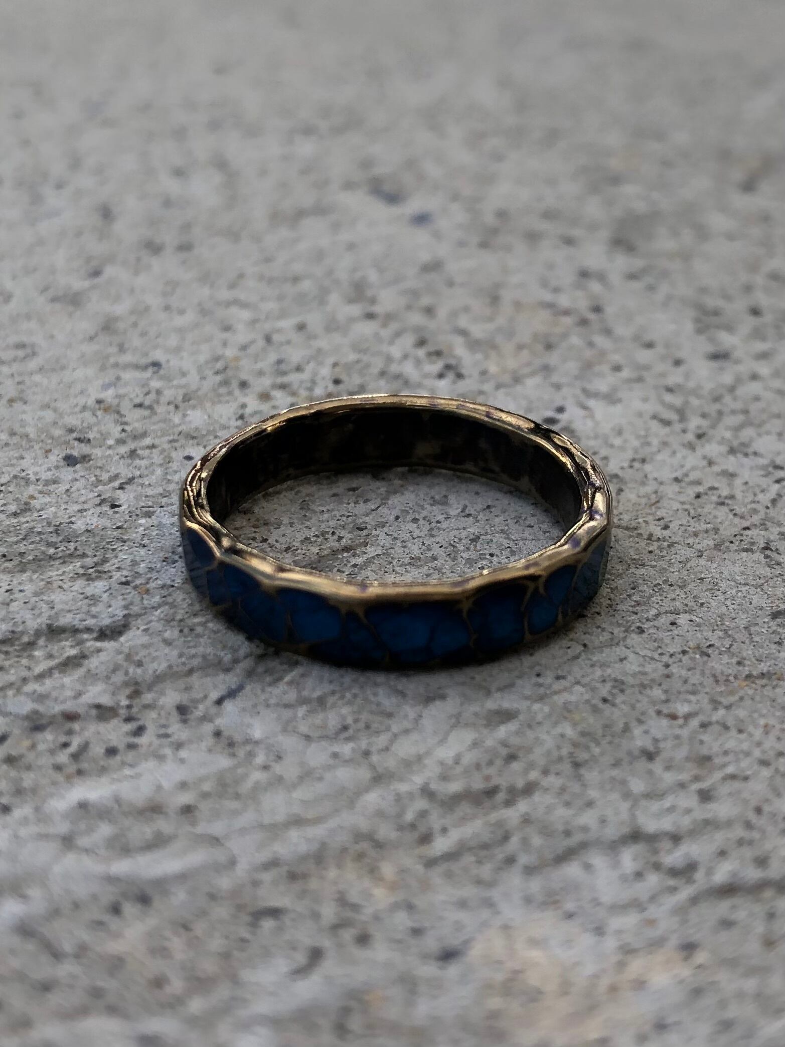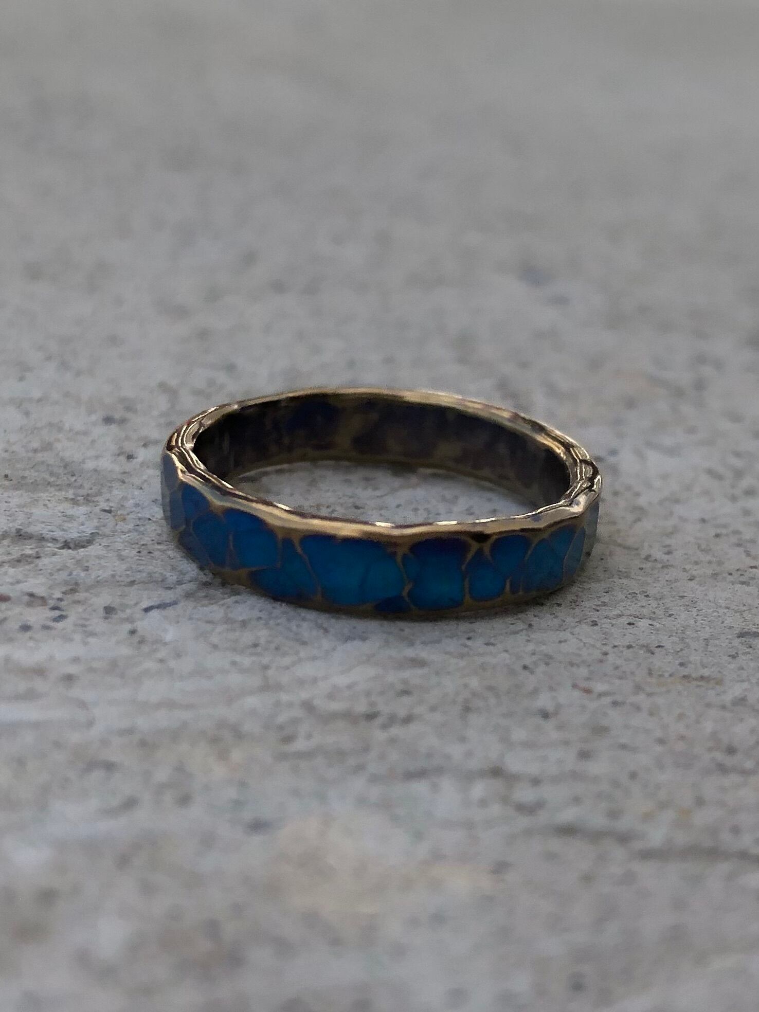 チタンをハンマーだけで成形した鍛造品、古代エジプトをテーマにブルーとゴールドで表現したアンティーク調の指輪です。打撃で凹を打ち込んでおりますので同じ物は存在しない唯一無二のリングとなっております。通常は平らな状態で鎚目(打撃)で凹を作っていくのですがroyalは形どってからの打撃で凹を入れていくのでより凹が強調されキラキラがキレイに光ります。ハンマーだけで仕上げた世界に一つだけの作品です。 3φ tb340 幅約4mm