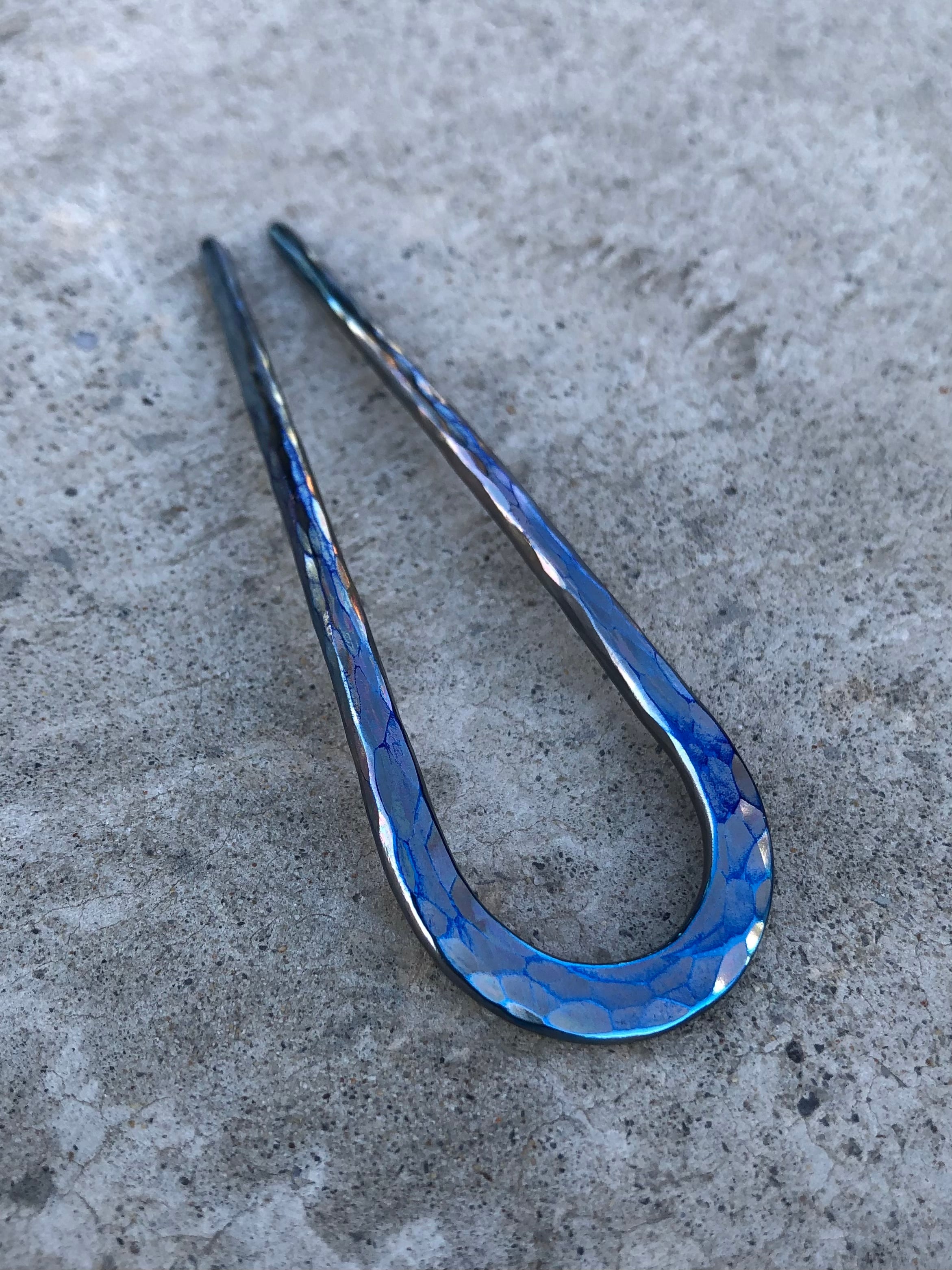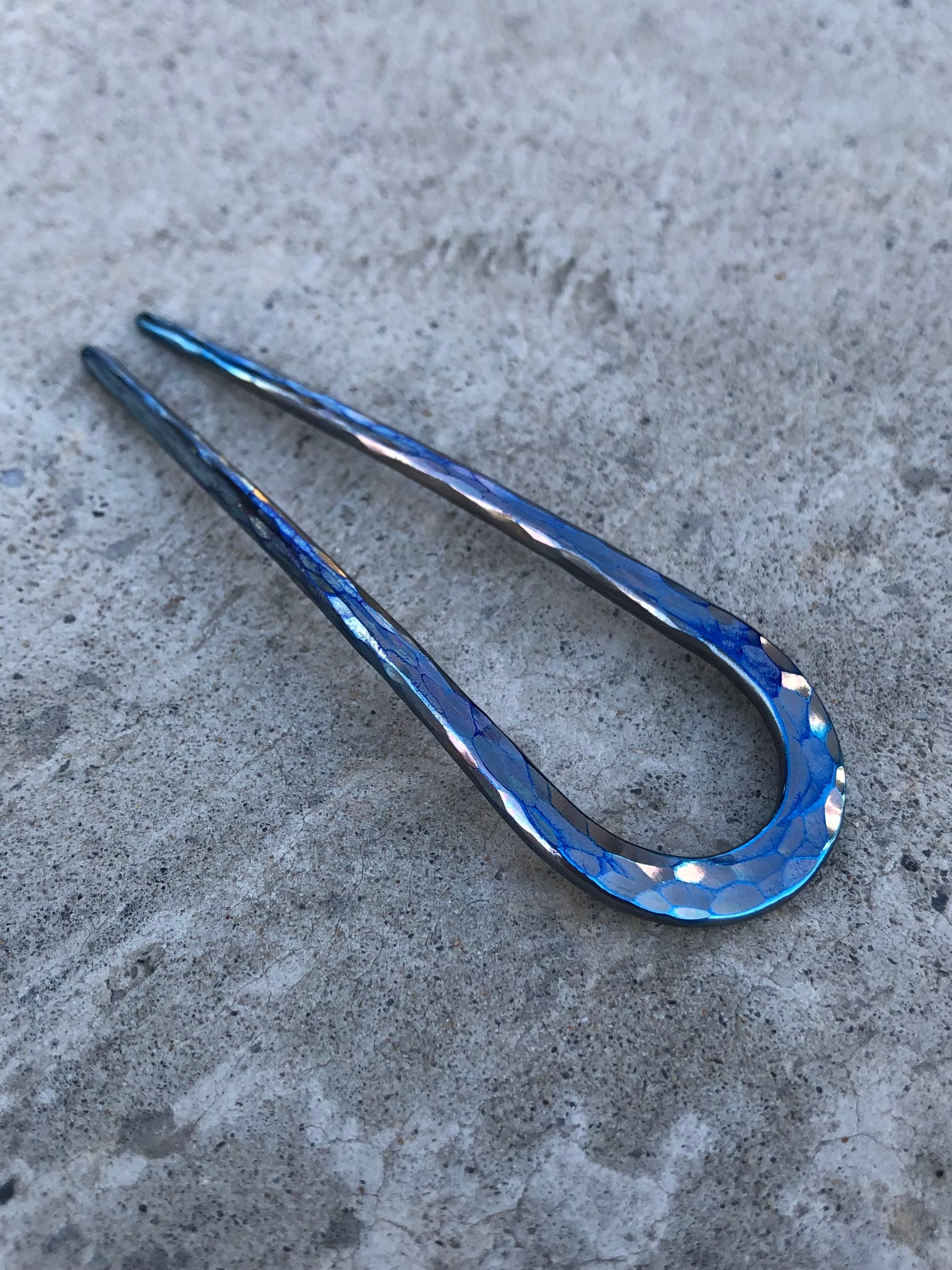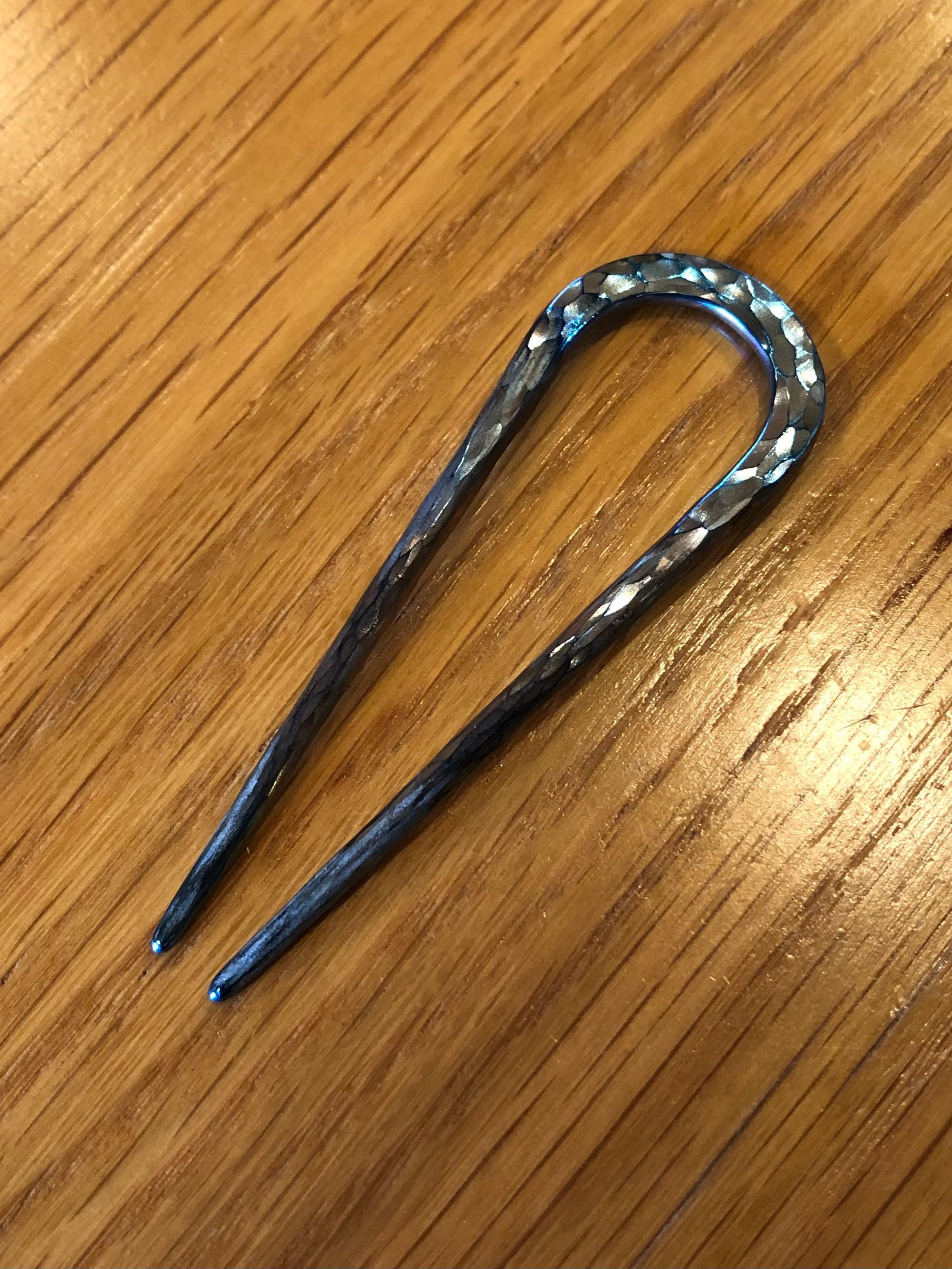 チタンを火とハンマーで製作した二本軸のショートかんざし。薄いお色のレインボーロックにブルーが輝くちょっぴり大人なヘアスティックは光の当たり具合で色んな色が変化し、鎚目を入れた輝きあるグラデーションが楽しめます。純チタン製なのでとにかく軽く、頑丈で使いやすい作品です。