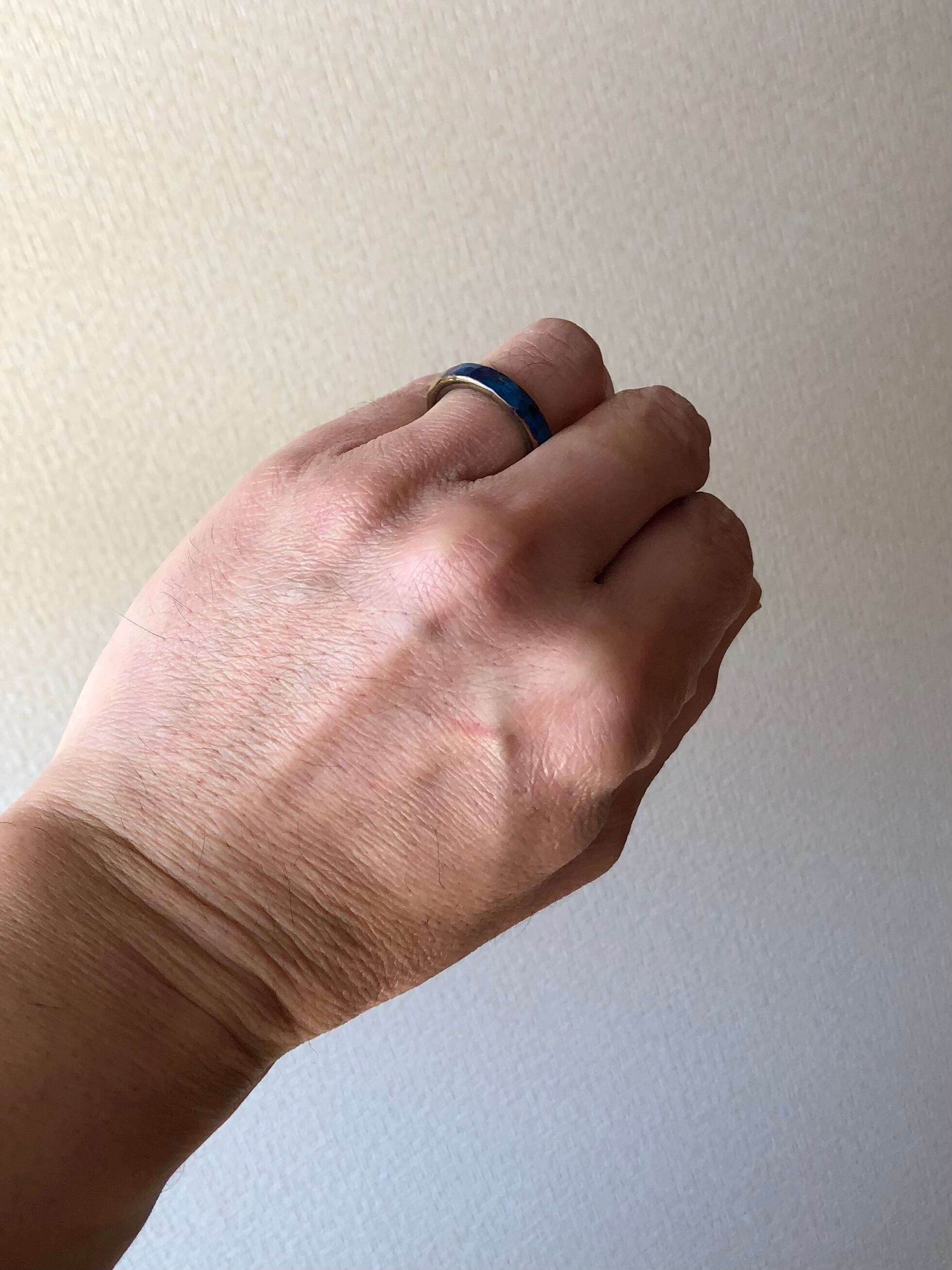 チタンをハンマーだけで成形した鍛造品、古代エジプトをテーマにブルーとゴールドで表現したアンティーク調の指輪です。打撃で凹を打ち込んでおりますので同じ物は存在しない唯一無二のリングとなっております。通常は平らな状態で鎚目(打撃)で凹を作っていくのですがroyalは形どってからの打撃で凹を入れていくのでより凹が強調されキラキラがキレイに光ります。ハンマーだけで仕上げた世界に一つだけの作品です。