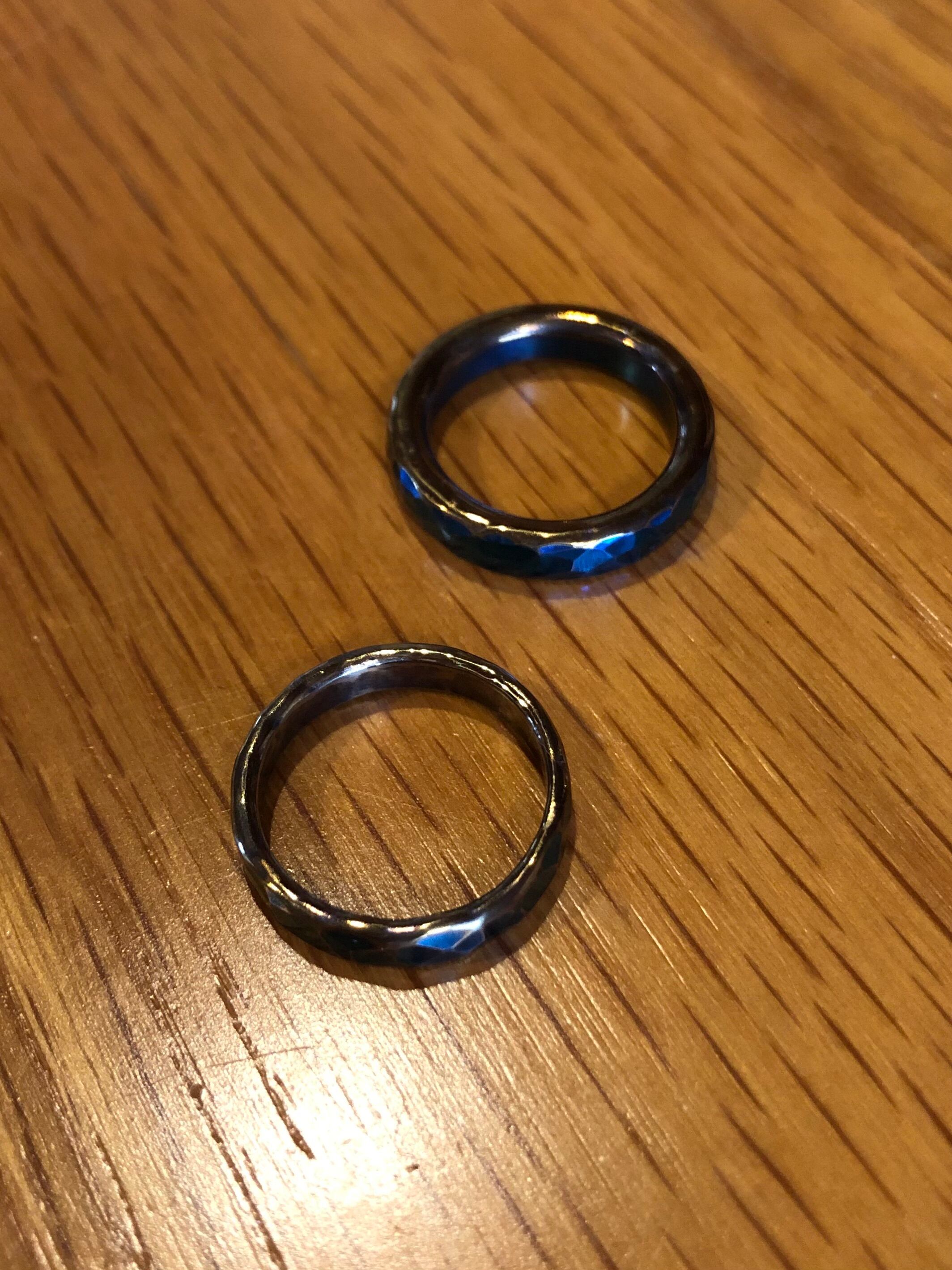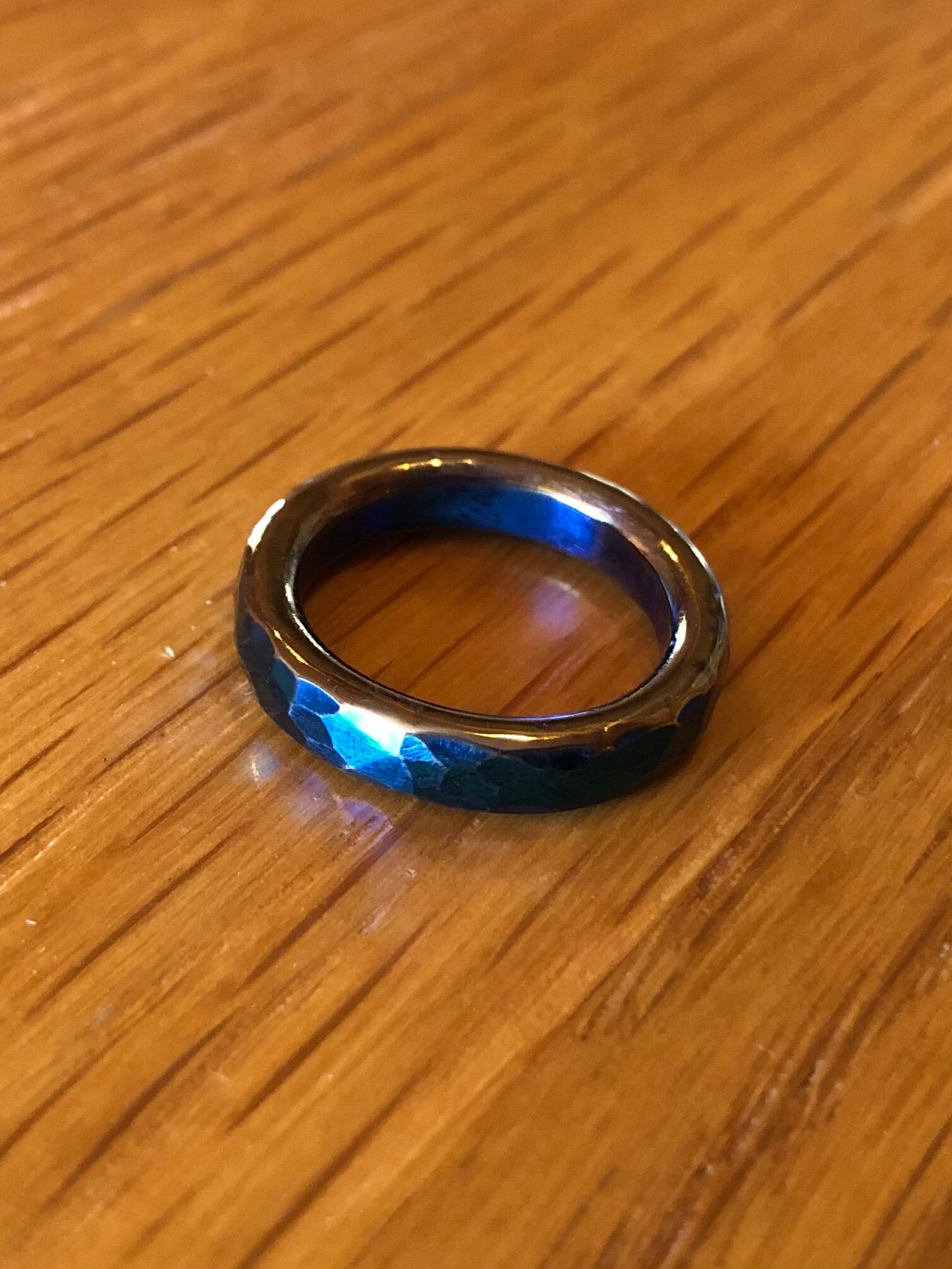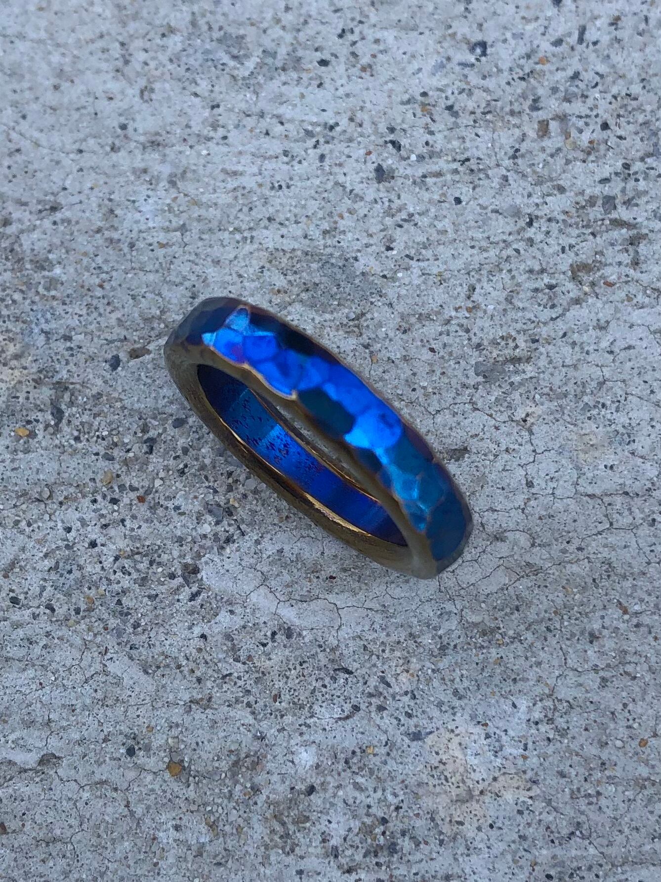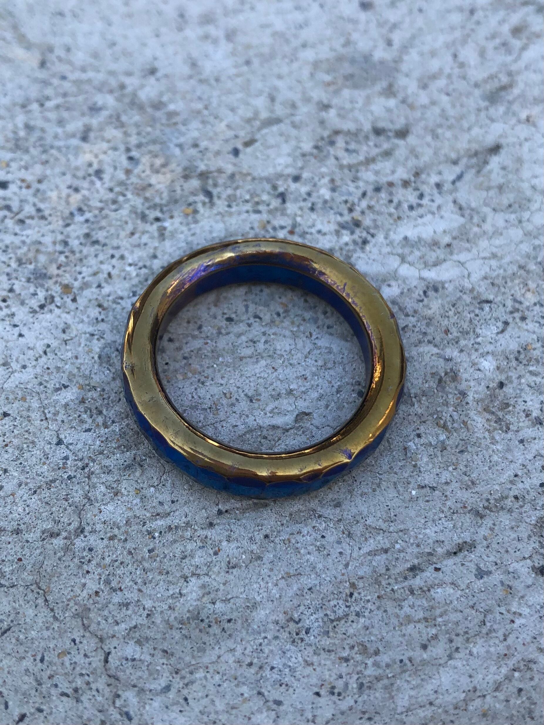 チタンをハンマーだけで成形した鍛造品、古代エジプトをテーマにブルーとゴールドで表現したアンティーク調の指輪です。打撃で凹を打ち込んでおりますので同じ物は存在しない唯一無二のリングとなっております。通常は平らな状態で鎚目(打撃)で凹を作っていくのですがroyalは形どってからの打撃で凹を入れていくのでより凹が強調されキラキラがキレイに光ります。ハンマーだけで仕上げた世界に一つだけの作品です。