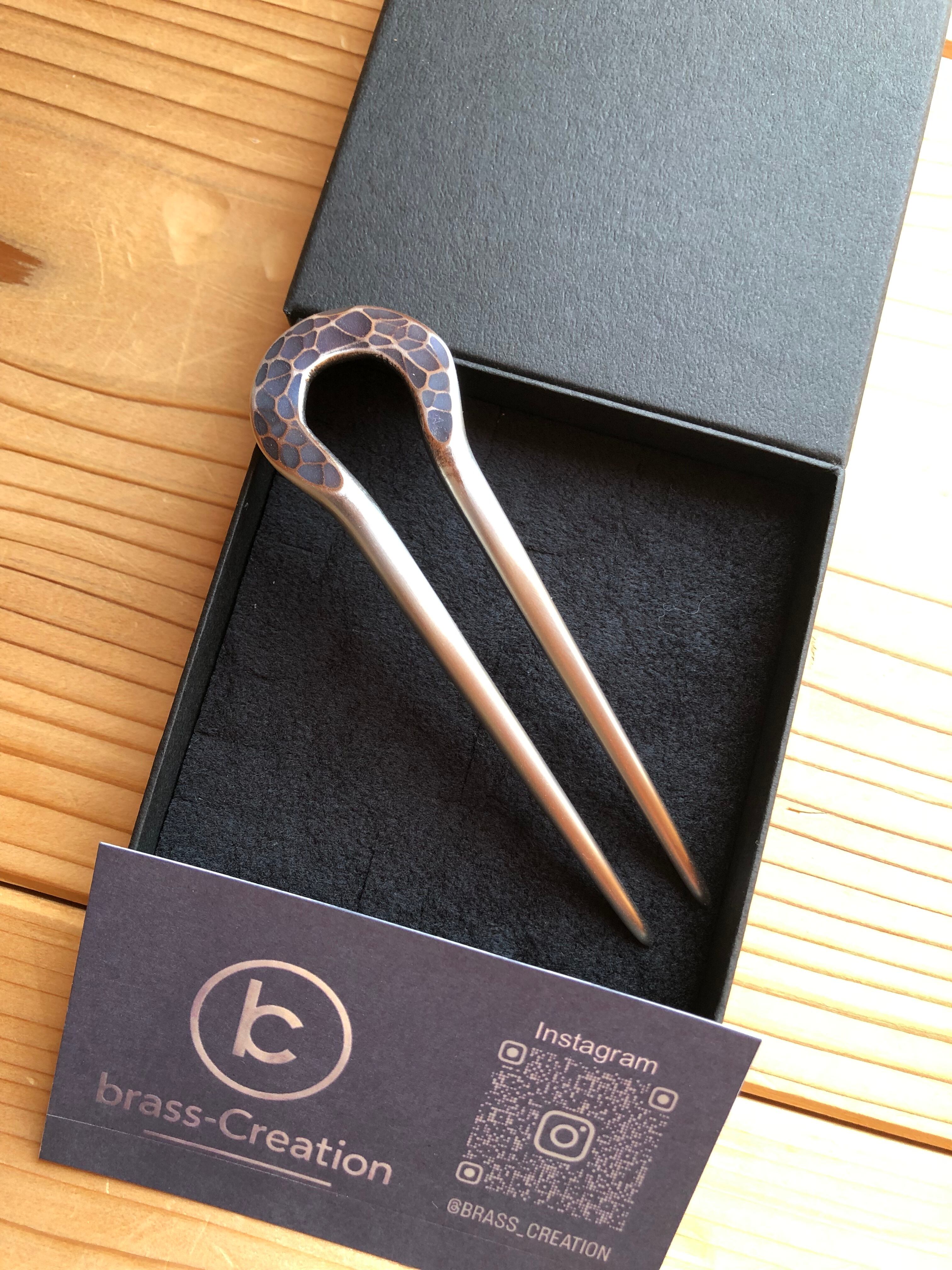 チタンを火とハンマーで製作した二本軸のかんざしは