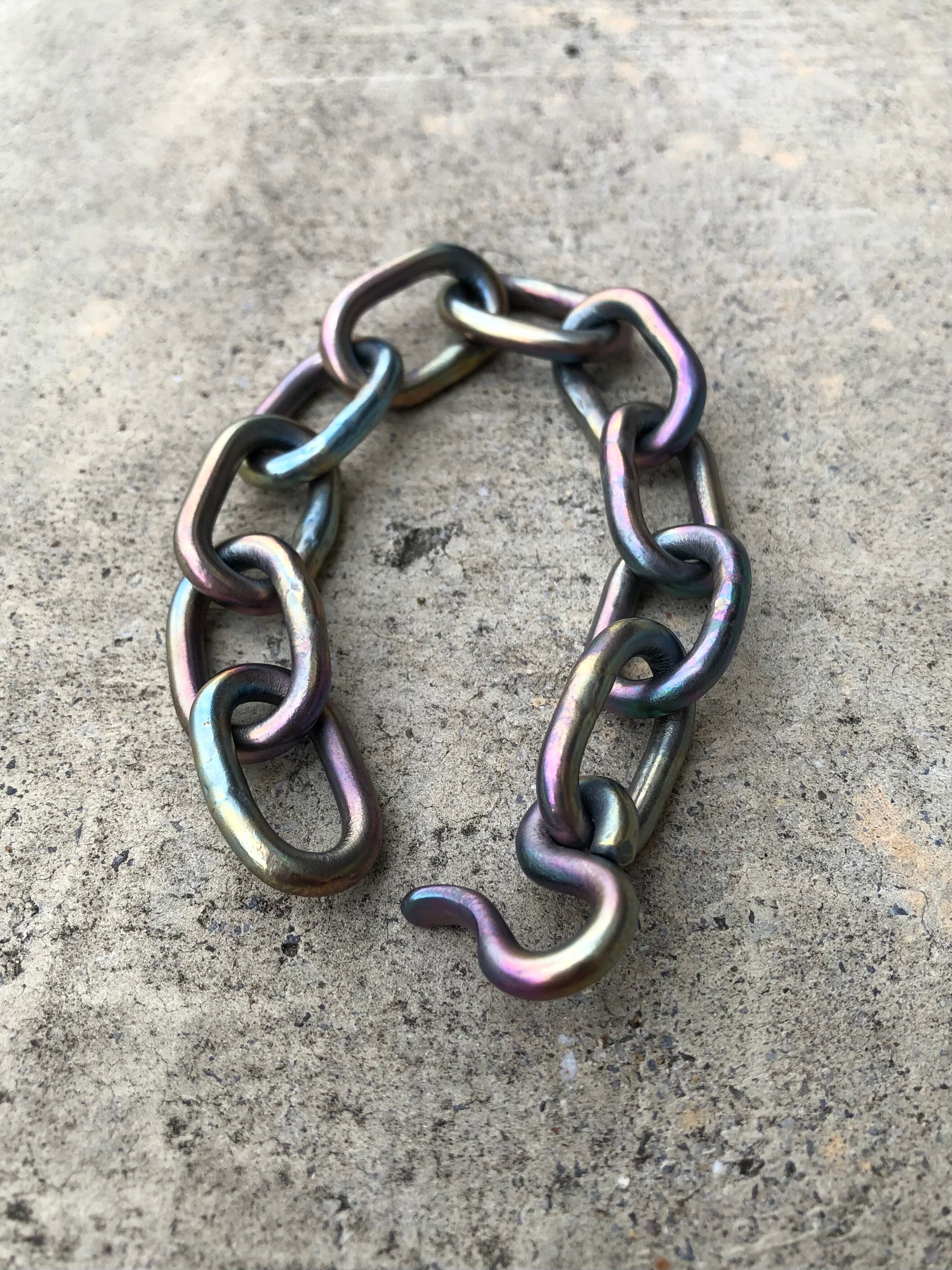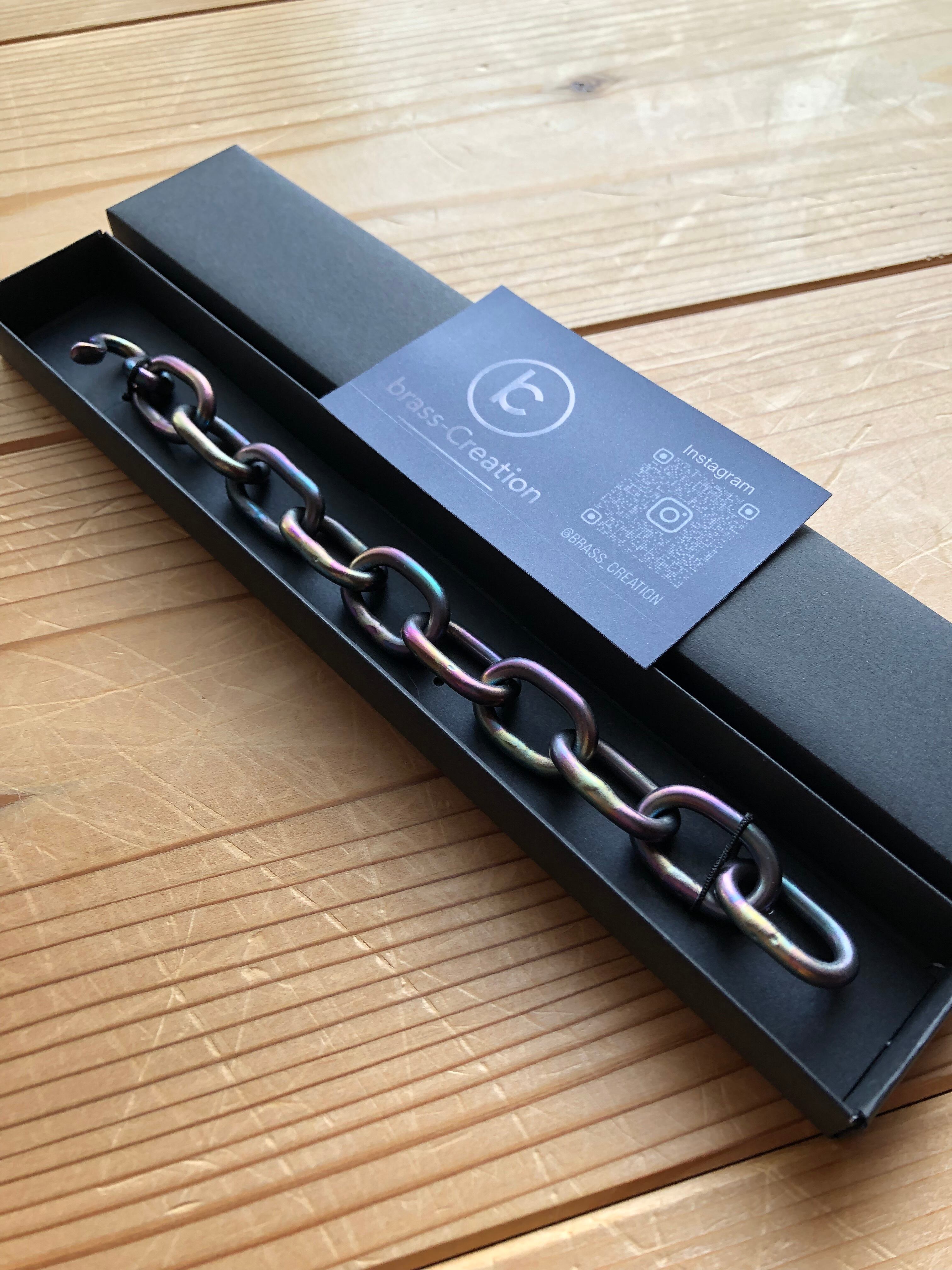 チタンを火とハンマーで製作したロッカーチェーンブレスレット、全てフリーハンドで仕上げた手作りチェーンを宇宙の虹をイメージし、絵に描いたようなマット感で仕上げました。線形4mmと太いのが特徴、インパクトのあるブレスレットつけていても疲れないぐらい軽いのが良いですね。 女性におすすめの大型チェーン、手首周りのドレスアップにおすすめです。