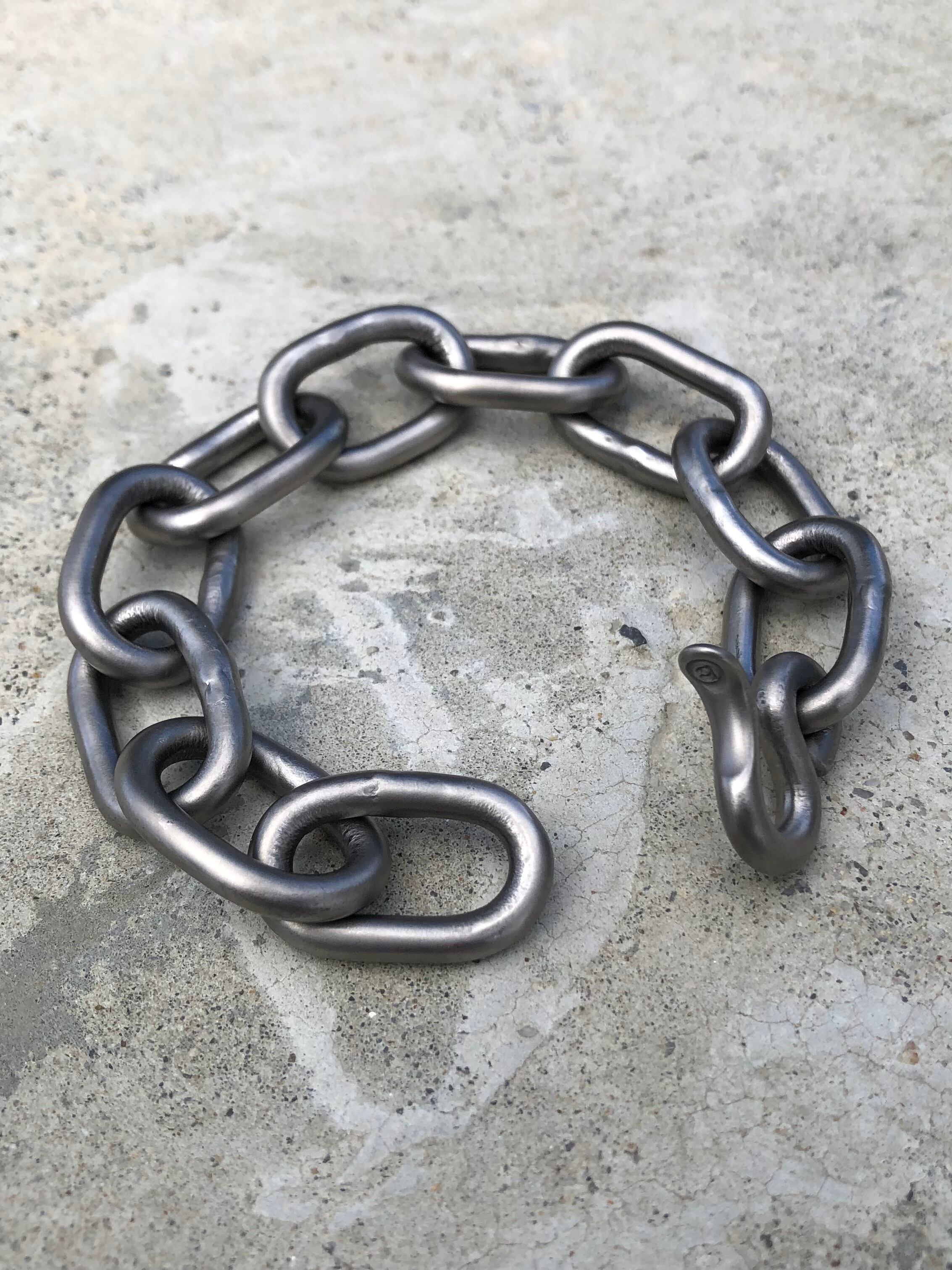 チタンを火とハンマーで製作したロッカーチェーンブレスレット、全てフリーハンドで仕上げた手作りチェーンは形無しで曲げて成形しておりますのでひとつひとつ微妙に形が違います。サンドブラストで仕上げ、軽く磨き艶消しの高級感あるれるアンティーク調のチェーンブレスレットです。線形4φと太いのが特徴でインパクトのある大型のブレスレットですがつけていても疲れないぐらい軽く女性におすすめの大型チェーンです。手首周りのドレスアップにおすすめです。金属アレルギーも少なく真夏でも愛用していただける素材です。