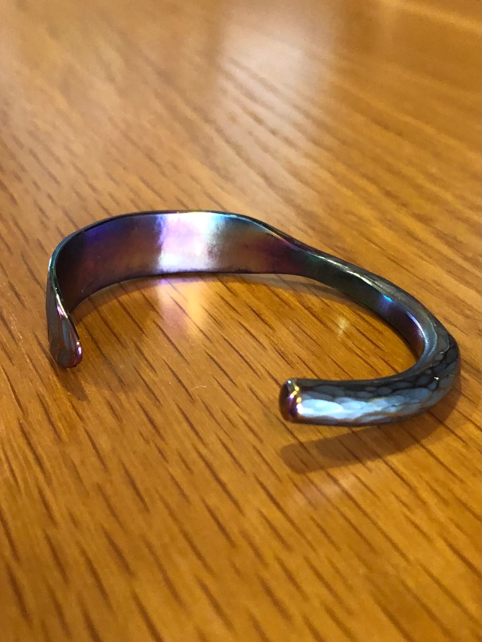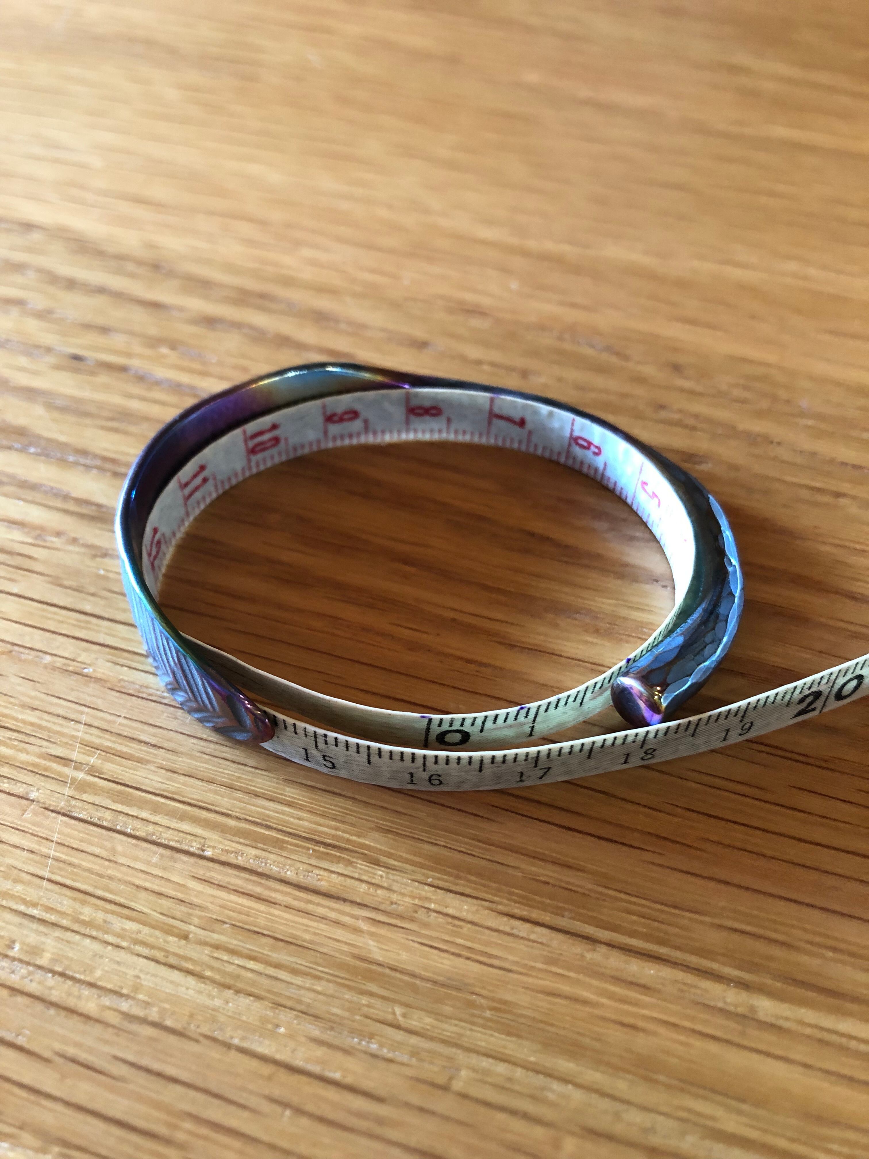 titanium bangle rainbow branch leaf “枝の葉” バングルは、チタンを火とハンマーで丁寧に製作しました。これからの季節にピッタリの虹色に輝く枝の葉デザイン、軽量ながらも存在感抜群です。特別な occasion でも日常のスタイルにもぴったりフィットします。